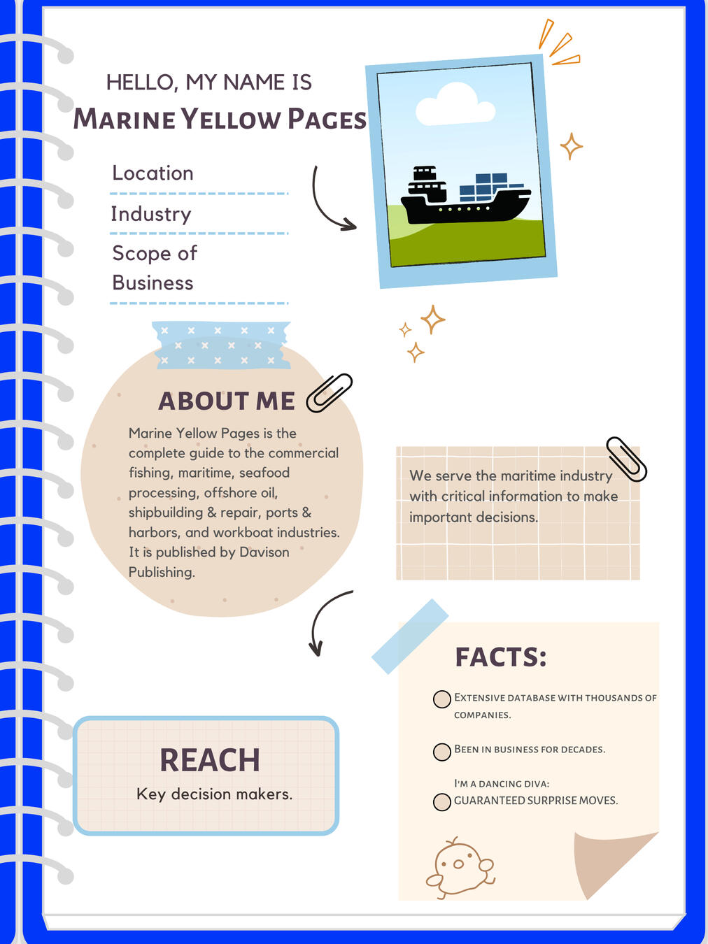 Davison’s Marine Yellow Pages Book is the “Official Sourcebook for the marine industry.” This book contains company profiles of Marine related companies, which are categorized into over many headings. The book is currently distributed to the top decision makers in the industry. Categories are listed geographically and alphabetically while manufacturers and suppliers are listed alphabetically and under the various headings of products that they sell.